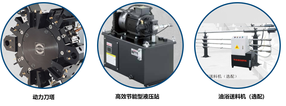 ●搭载12工位动力刀塔,Y轴、主轴及副轴,可在同一几台进行车、钻、攻等复合加工功能,一次设定完成整个加工过程。